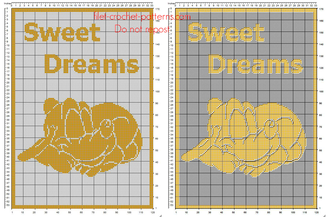 Free filet crochet pattern baby blanket with Disney baby Pluto and text sweet dreams Pattern added on August 5, 2021 by Eta